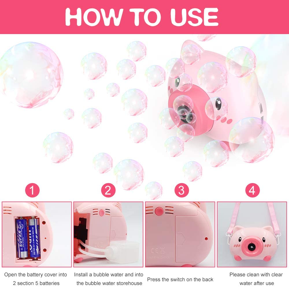 Easy to use: Powered by 3 x AA batteries, you just need to press the ON/OFF button for the pink pig bubble machine to work after the solution refilling. No need for complicated installation or refill process, the easiest bubble machine for kids to DIY and exercise their eye-hand cooperation ability.